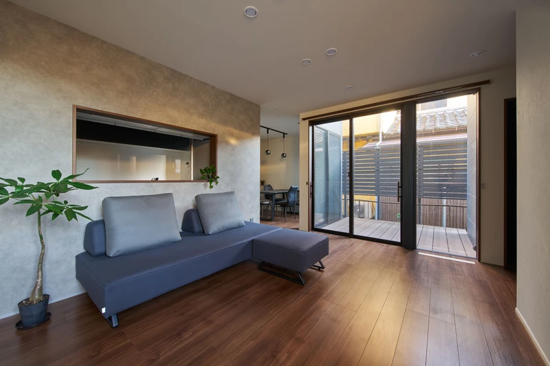 内部は1階に中庭、2階にロフトを設けることで実際の床面積以上の広がりを確保し、部屋をずらした配置によって家族の気配がやわらかくつながる構成としています。