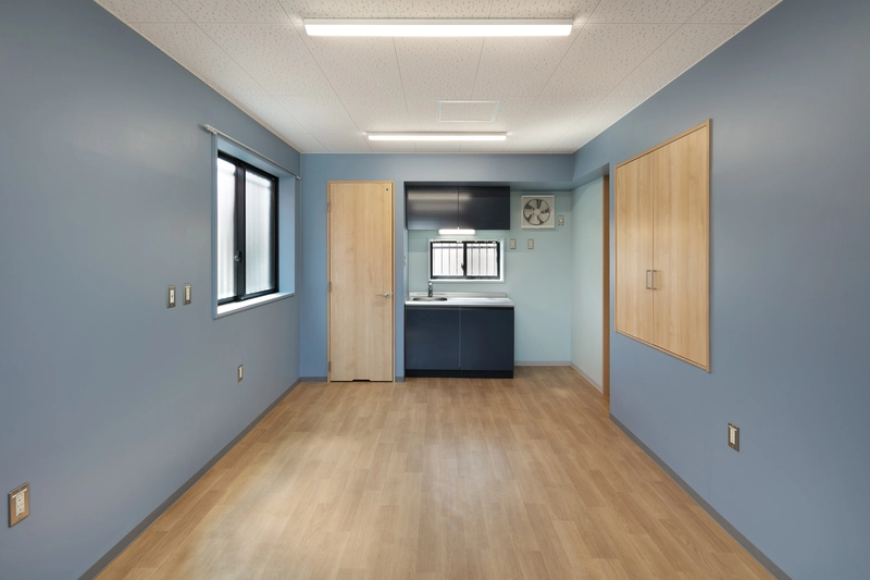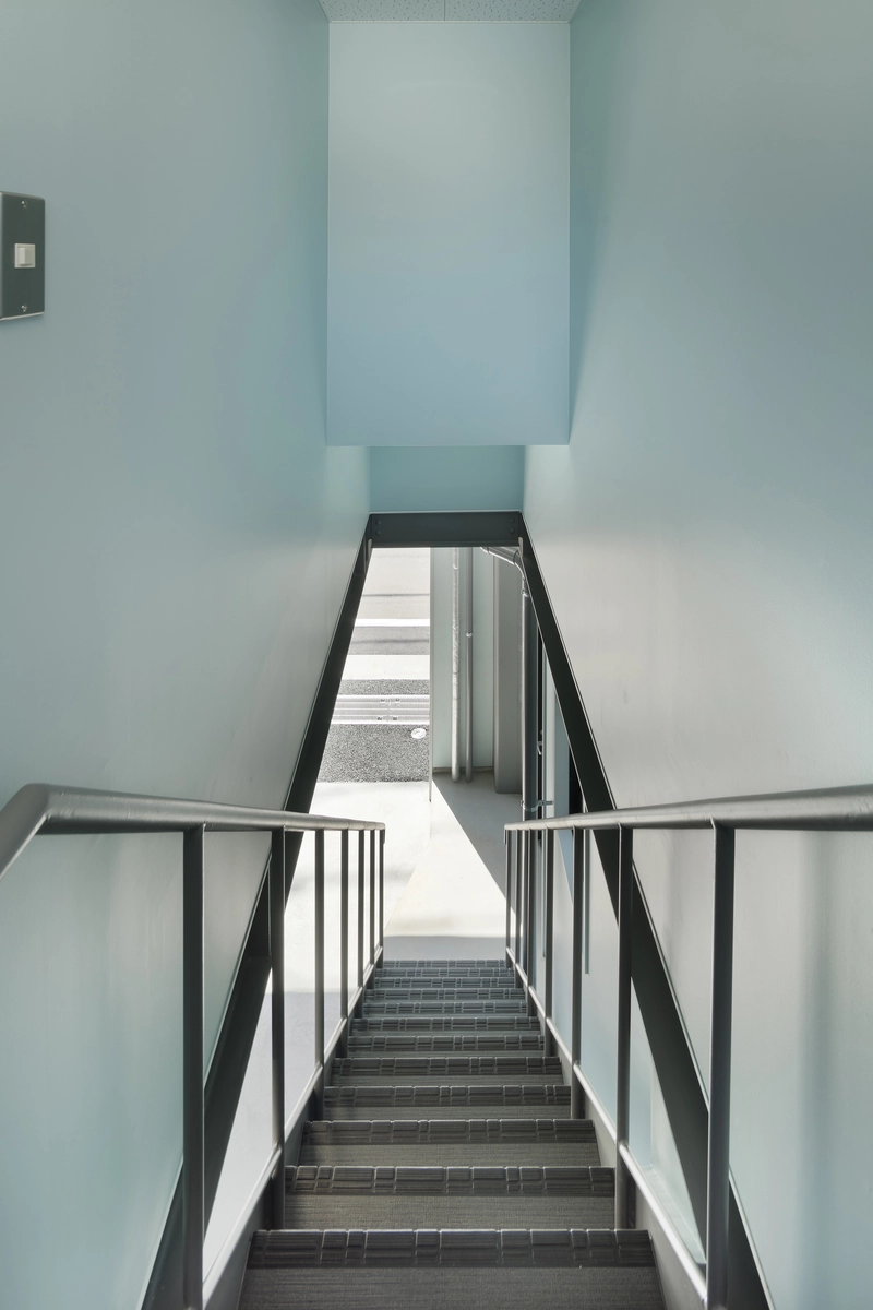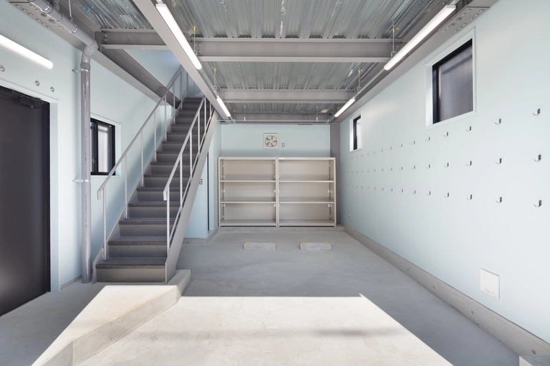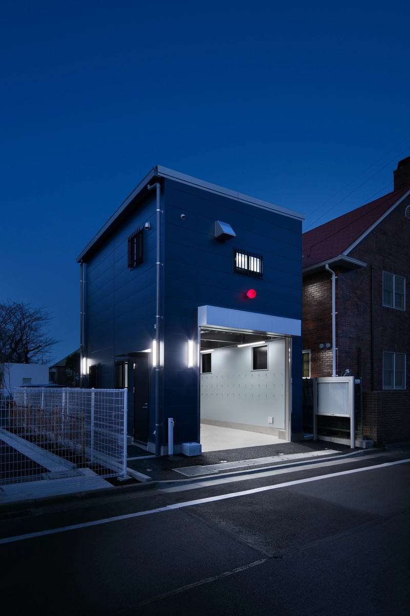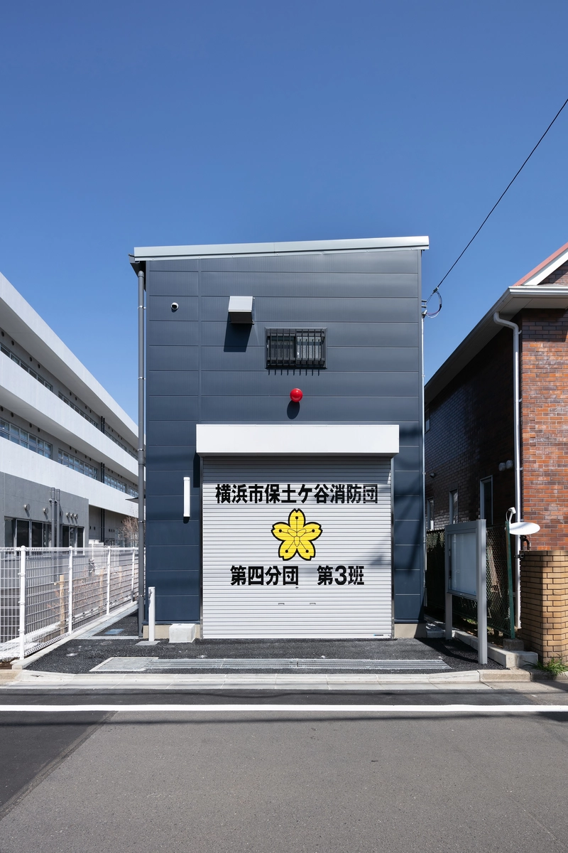 閑静な住宅街にあるこの建物は消防団車両・資機材を格納するほか、災害時の作戦本部となる会議室や女性団員も安心して利用できるトイレ・更衣室を備えています。質素になりがちな内外装は親しみの湧く配色にしました。