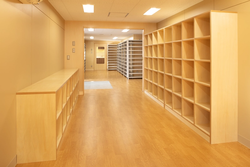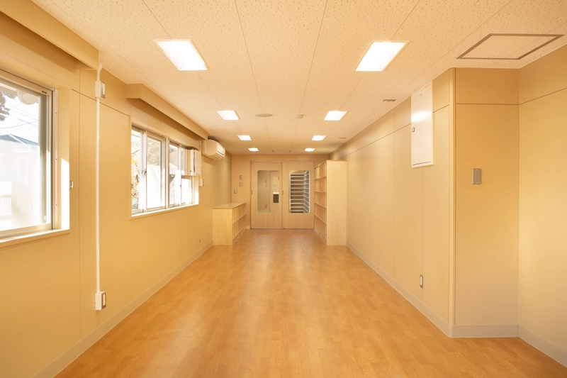 キッズスペース、昇降口、事務室をひと続きに配置し視線をつなげることで、狭い空間が少しでも広く感じるよう計画しました。同時に死角やコーナーもなくなり、安全性や管理のしやすさにも配慮しています。