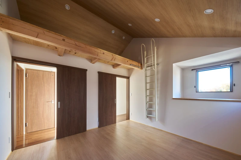 内部は1階に中庭、2階にロフトを設けることで実際の床面積以上の広がりを確保し、部屋をずらした配置によって家族の気配がやわらかくつながる構成としています。