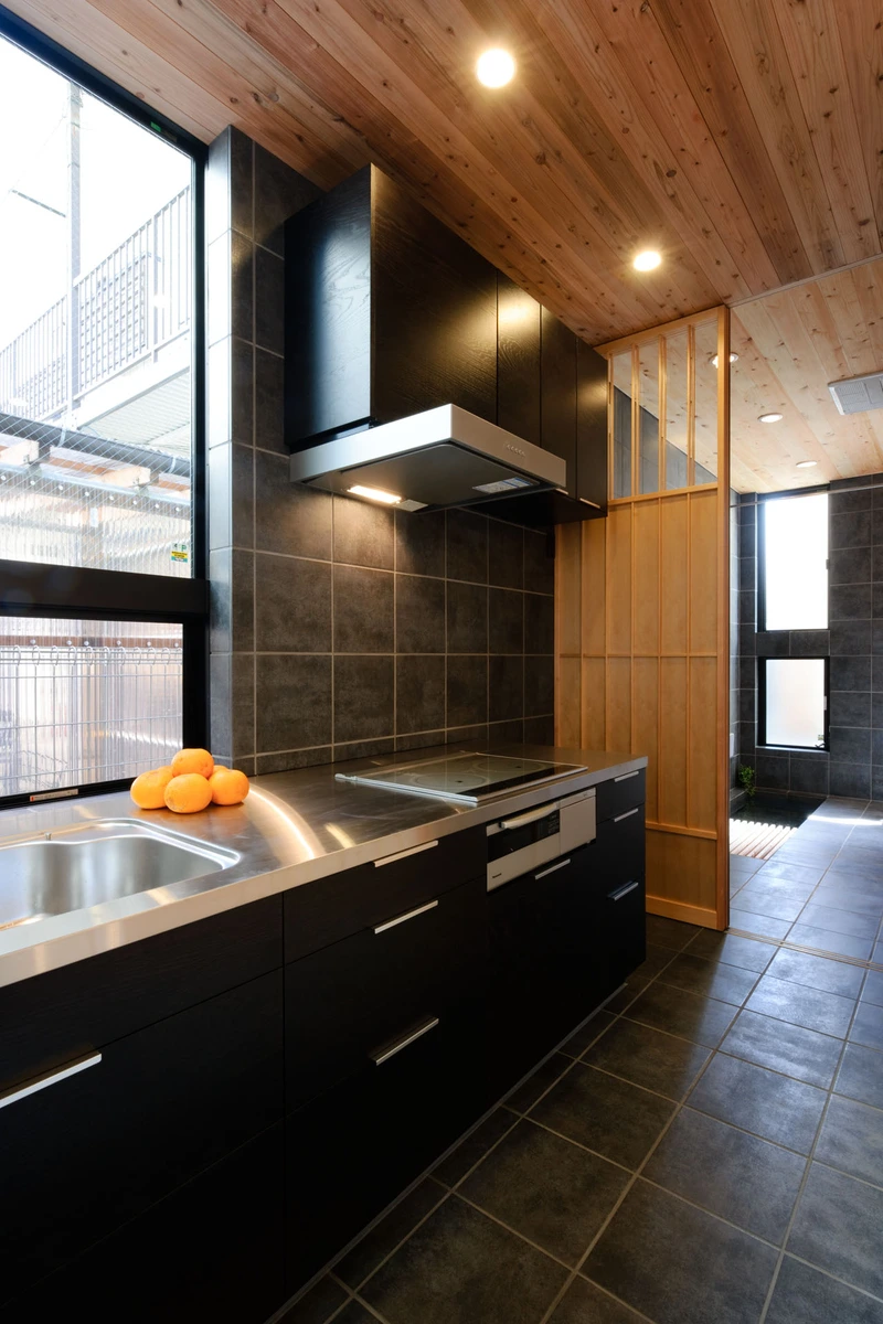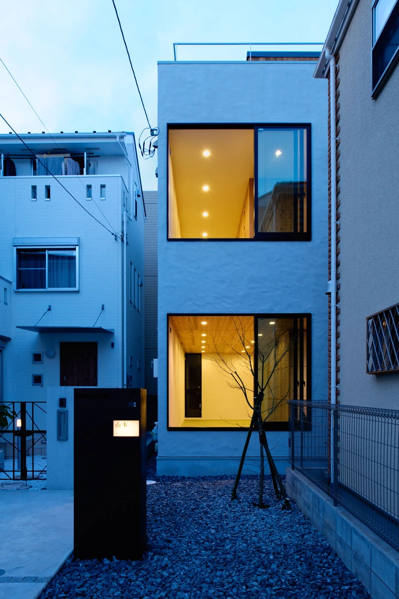 四方を建物に囲われた旗竿地に1階が親夫婦、2階が子夫婦+子供の二世帯住宅に加えて子夫婦の仕事場を設けた計画です。